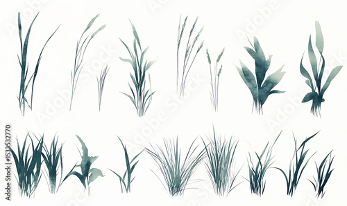 © sathian, Naklejka premium Highly detailed illustrations of various trees, leaves, grasses, and botanical elements, featuring realistic, minimalist, and abstract compositions on a white background.