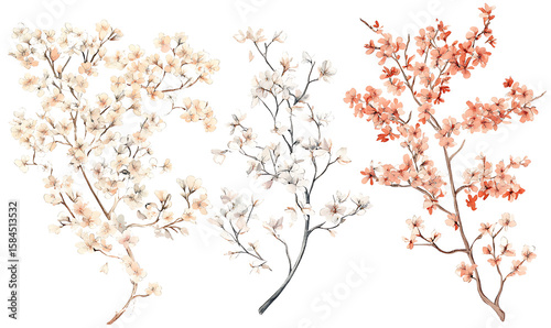 © anan, Fototapeta premium Highly detailed illustrations of various trees, leaves, grasses, and botanical elements, featuring realistic, minimalist, and abstract compositions on a white background.
