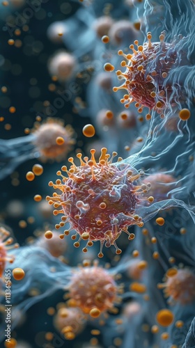 Naklejka premium Highly detailed visualization of microscopic viruses floating and interacting within a dynamic environment, showcasing their complex structure and vibrant colors