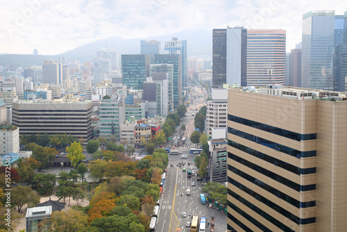 © Pavel Losevsky, Naklejka premium Highrise building and highway near park with Pagoda Vongaksa in smoky morning in Seoul