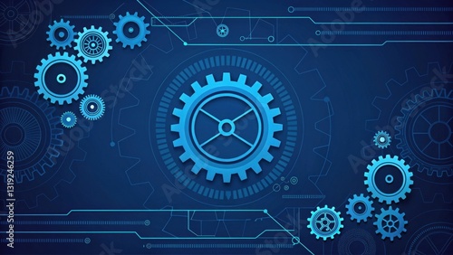 © Gibster, Fototapeta premium Hightech coding background with digital technology. Abstract blue background with gears and digital elements representing technology and innovation.