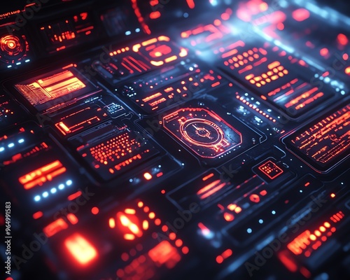Fototapeta premium Hightech hacking toolkit with advanced digital interfaces, encrypted devices, and sleek, futuristic design elements in a darkened environment