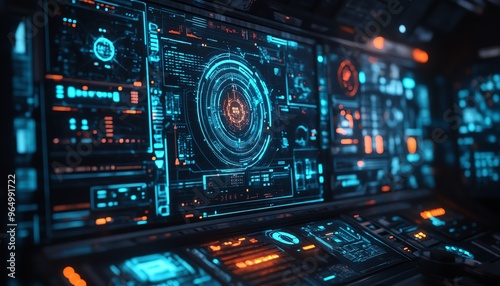 Fototapeta premium Hightech hacking toolkit with advanced digital interfaces, encrypted devices, and sleek, futuristic design elements in a darkened environment