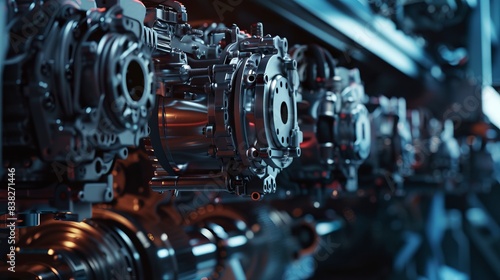 © Sirisook, Fototapeta premium Hightech machinery processing galvanize alloy, side view, highlighting manufacturing techniques, cybernetic tone, complementary color scheme