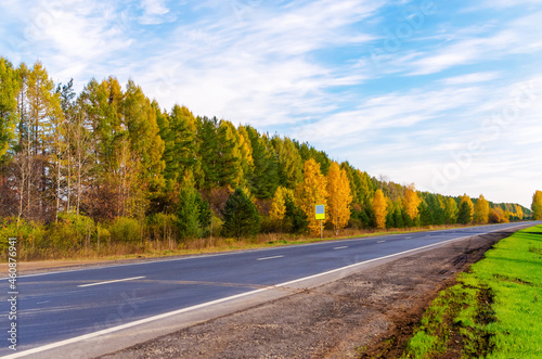 © Родион Бондаренко, Fototapeta premium highway along the autumn forest with yellow foliage