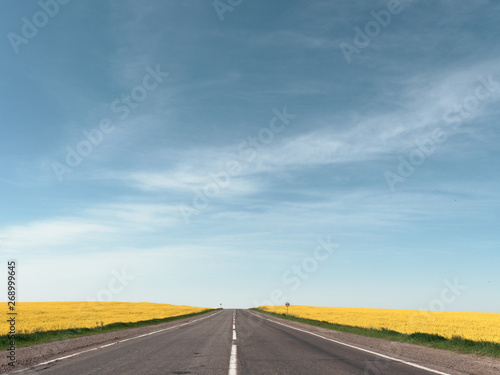 Fototapeta premium highway among rapeseed yellow field against a blue sky