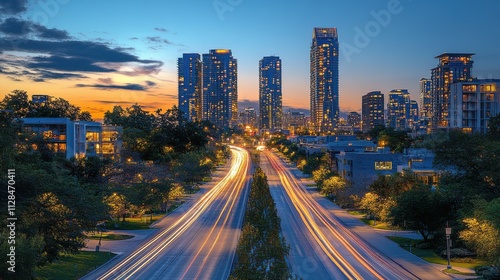 © Hvkk, Fototapeta premium highway and modern city at night with light trails