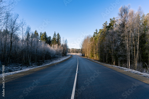 Fototapeta premium Highway. Highways white line. Asphalt road between frosty trees in the sunny day