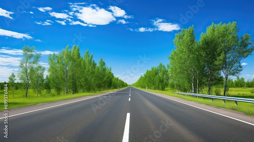 © @_ greta, Naklejka premium highway in the grassland background of blue sky and bright clouds, long road stretches into the distance. empty street on a beautiful sunny day