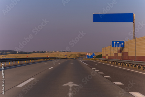 Fototapeta premium highway road in the countryside, roadside and asphalt, green forest and blue...