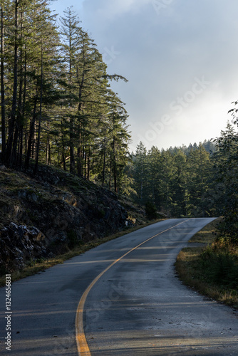 © Emma Tuttle, Obraz premium Highway surrounded by forest with cloudy sky in Bowen Island, British Columba, Canada