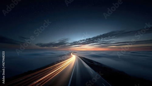 © Guawan, Fototapeta premium Highway through a sea of clouds at dawn. Stars visible. Long exposure lights