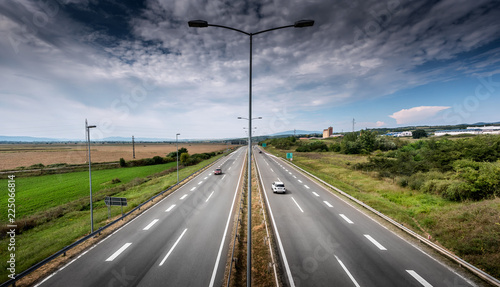 © Ivan, Fototapeta premium Highway Traffic on a straight road on a Cloudy Day through pastoral landscape
