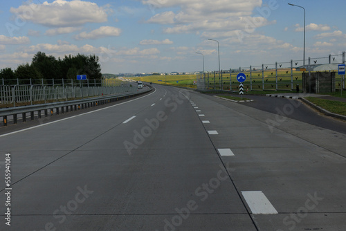 Fototapeta premium Highway wide road in the city, transport and blue sky with clouds on a summer...