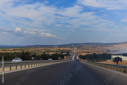 Fototapeta premium Highway wide road, transport and blue sky with clouds on a summer day