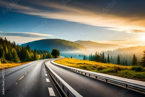 © Fatima, Fototapeta premium Highway with forest on background of blue sky with beautiful clouds.