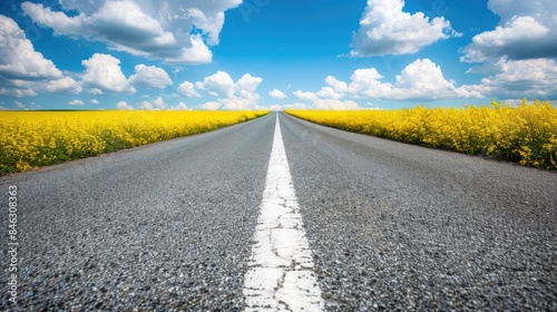 Naklejka premium Highway With White Markings, Flanked By Rapeseed Fields On A Clear Sunny Day With A Blue Sky