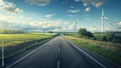 © Digital Design, Fototapeta premium Highway with wind farm, renewable energy, rural landscape