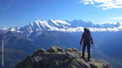 © bulegendut, Fototapeta premium Hiker admiring majestic snow-capped mountain range.