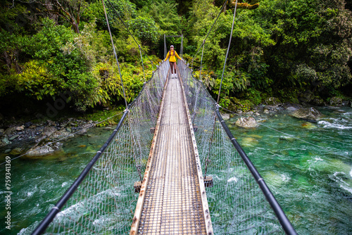 Fototapeta premium hiker crossing a rushing river in fiordland national park, new zealand south island, hiking trail to lake marian