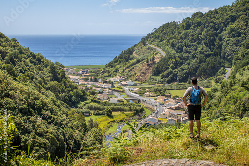 © Ayla Harbich, Naklejka premium Hiker enjoying view to Atlantic ocean, Azores travel destination, nature.