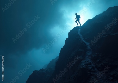© puruan, Obraz premium Hiker explores rocky terrain under a mystical blue light at dawn in the mountains