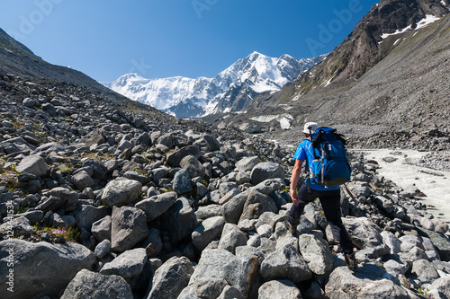 Fototapeta premium Hiker in highlands of Altai mountains, Russia