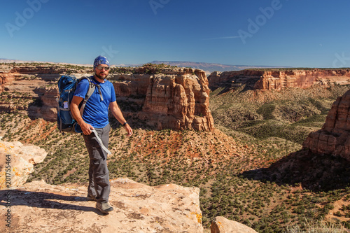 © Maygutyak, Fototapeta premium Hiker is sitting on the cliff in Colorado National monument, USA