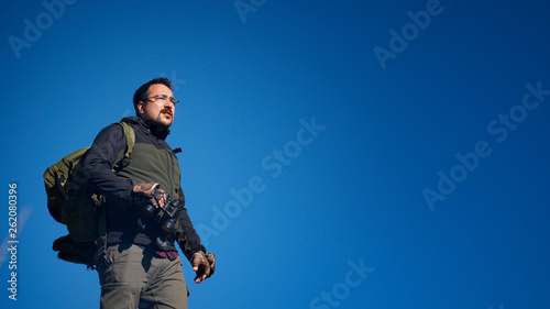 © barkn, Fototapeta premium hiker man on rocky mountain looking through binoculars