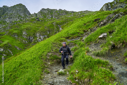 Fototapeta premium Hiker man with backpack on a mountain trail