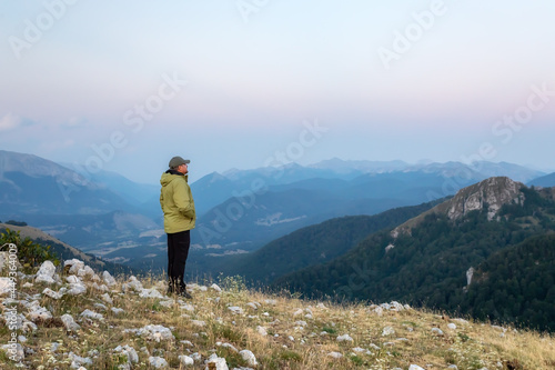© Gennaro Leonardi, Fototapeta premium Hiker meditates amidst the mountain landscape.