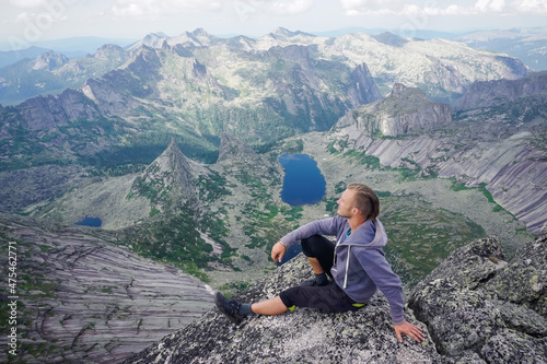 © Pavel, Obraz premium Hiker on top of a rock with a beautiful view of Ergaki natural practice
