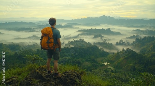 © arsyi_06, Naklejka premium Hiker overlooking misty mountain landscape.