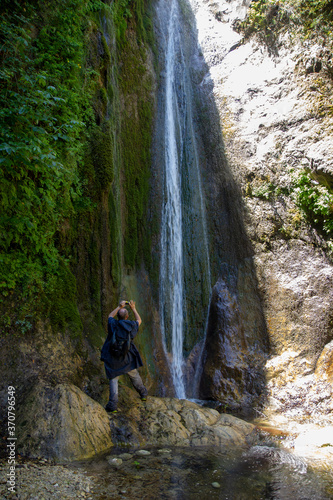 Obraz premium hiker photographing waterfall bard'natore in calabritto