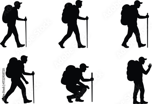 Obraz premium Hiker silhouettes with backpacks and walking sticks, trekking poses, outdoor...