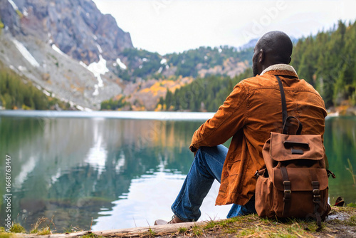 © Denny, Naklejka premium Hiker standing in mountains in orange jacket Man hiking in rocky mountains.
