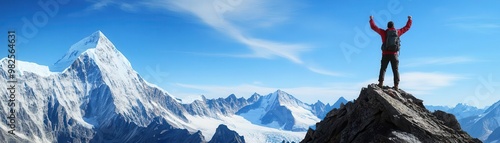 © SITTAKAN, Obraz premium Hiker standing triumphantly at the summit of a towering peak