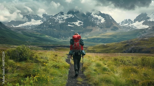 © Nazia, Fototapeta premium Hiker Trekking Towards Majestic Mountains - Adventure and Exploration Concept