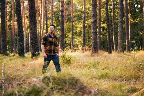 © baranq, Fototapeta premium Hiker walking in forest during autumn trip