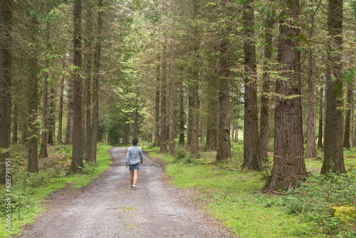 © Néstor MN, Obraz premium Hiker walking through the forest breathing fresh air. Gorbeia Natural Park