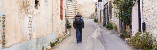 Fototapeta premium Hiker walks alone. Travel and adventures concept.