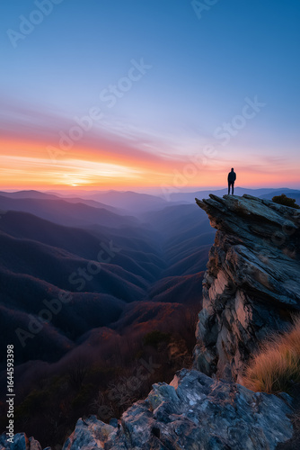 © Andres Mejia, Fototapeta premium Hiker watching colorful sunrise over majestic mountain range from rocky cliff