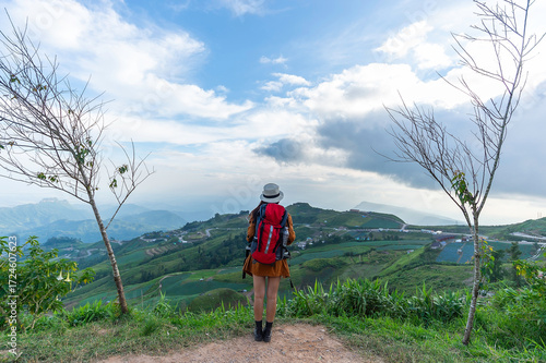 © tonjung, Naklejka premium Hiker woman feeling victorious facing on the mountain and celebrate success together on mt summit