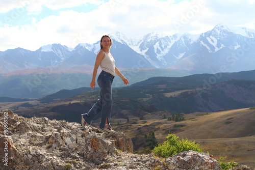 © Anton Belovodchenko, Obraz premium Hiker woman on top Aktash Altai mountains. Scenic view and snowy tops on background.