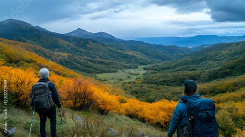 © bcendet, Naklejka premium Hikers admire autumnal mountain valley vista