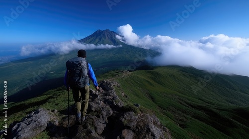 © MAKASIHMAS SIDNEY, Fototapeta premium Hikers ascends mountain ridge with volcano in background. Vast panoramic view, fresh air, and serenity