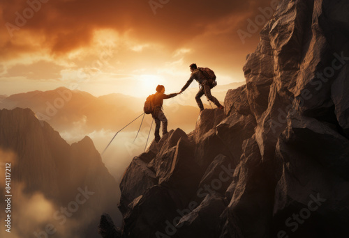 Fototapeta premium Hikers climbing on rock, mountain at sunset, one of them giving hand and...