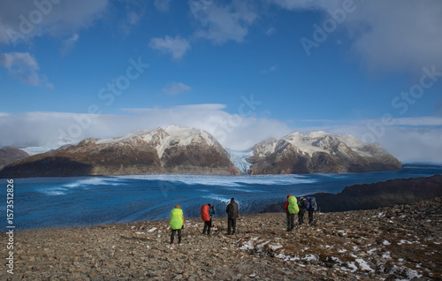 Naklejka premium Hikers enjoying the panoramic view of the Grey Glacier and snow-capped...