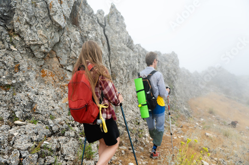 Obraz premium Hikers Exploring Foggy Mountain Trails with Backpacks and Trekking Poles