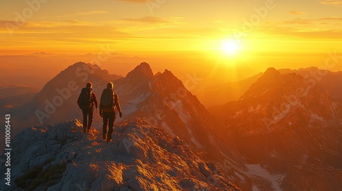 Fototapeta premium Hikers Reaching Summit At Sunset Over Majestic Mountains